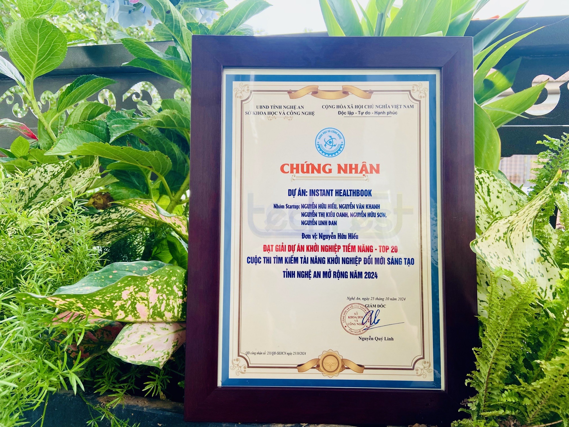 Ngày 25/10, Công ty TNHH 8Tech đã vinh dự được Sở Khoa học & Công nghệ phối hợp cùng Ủy ban Nhân dân tỉnh Nghệ An trao tặng giải thưởng “Dự án khởi nghiệp tiềm năng” cho dự án Instant Healthbook